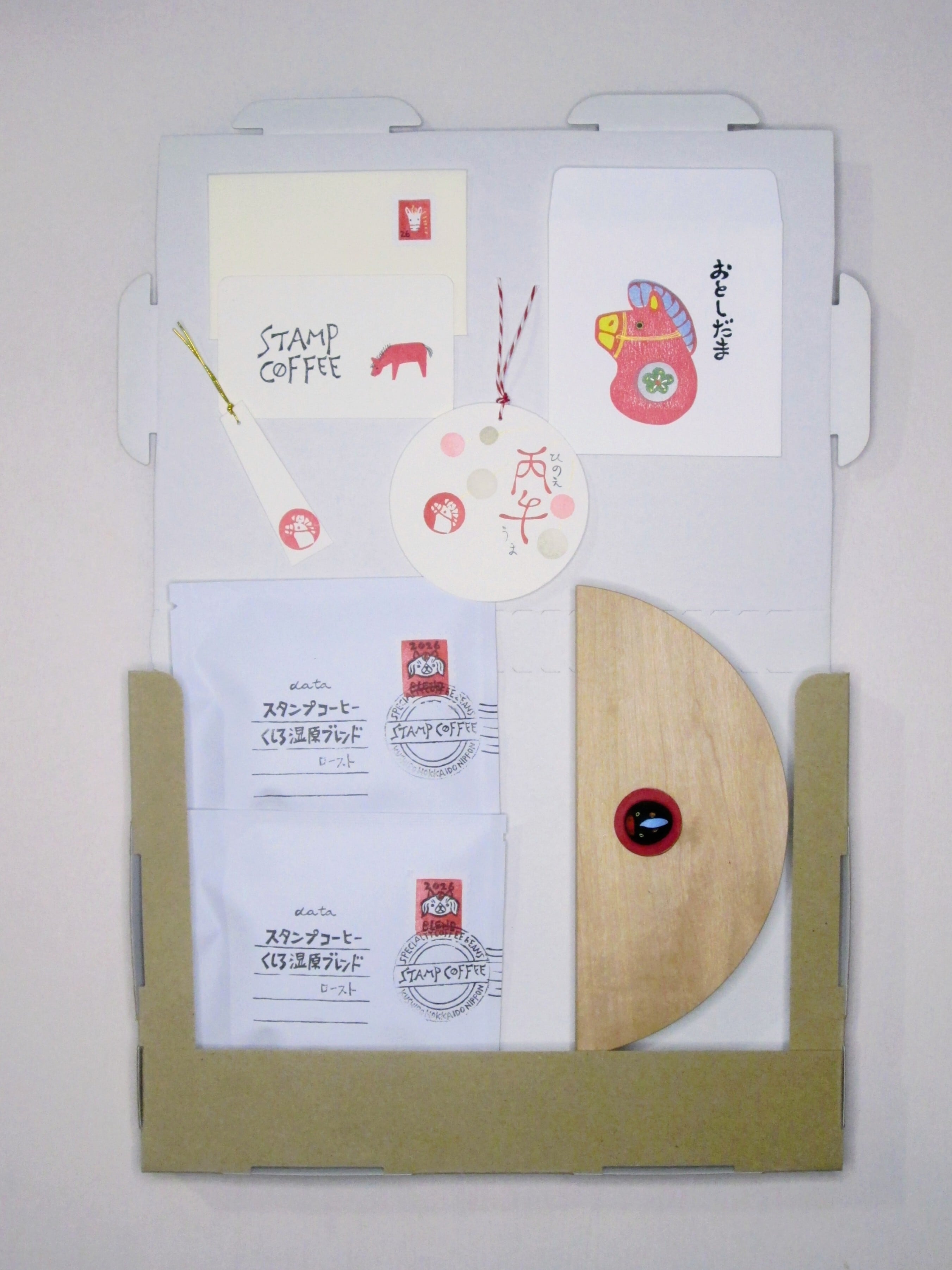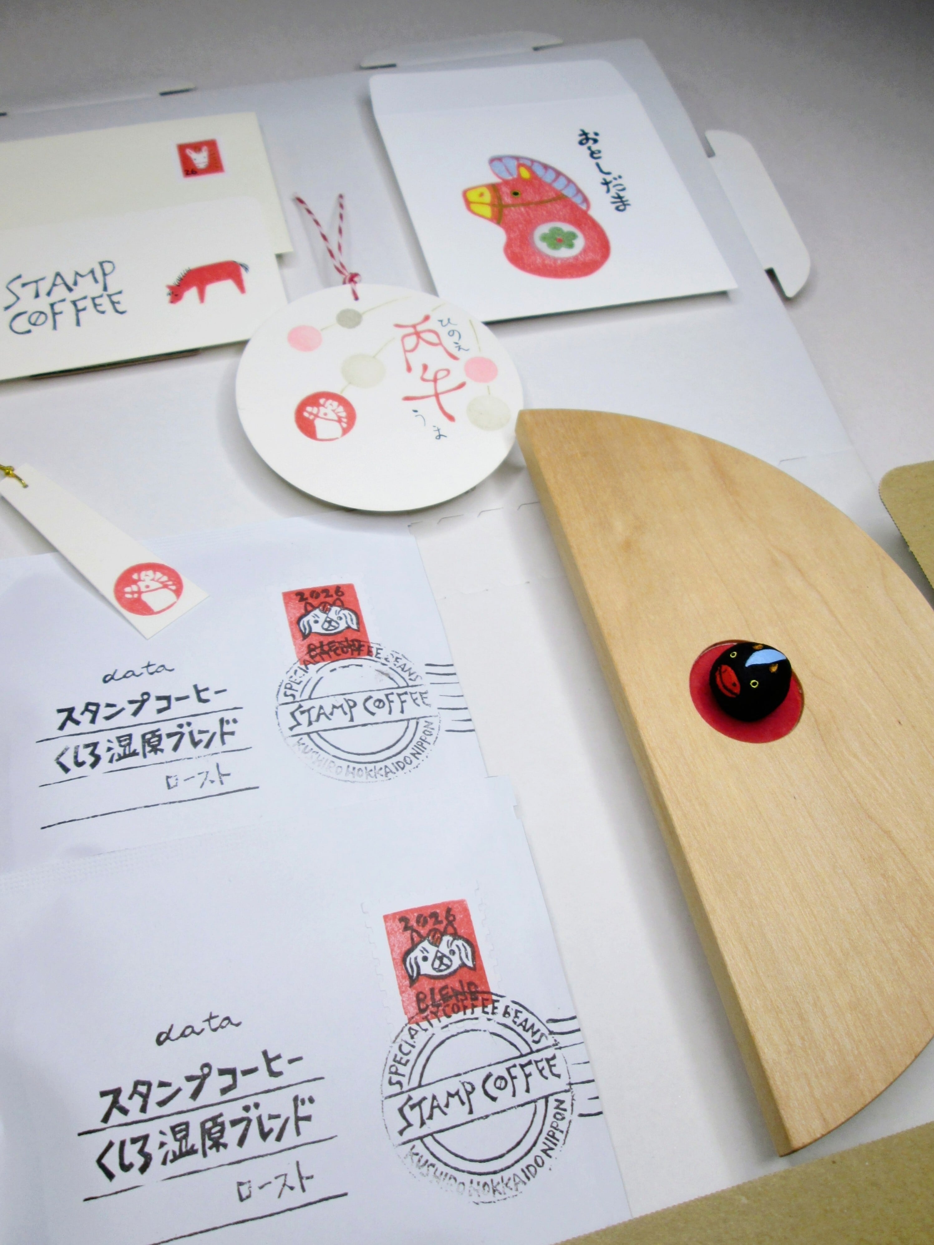 くしろ湿原『正月』ブレンドとともに、手仕事のぬくもりを感じる縁起物を詰め合わせました。