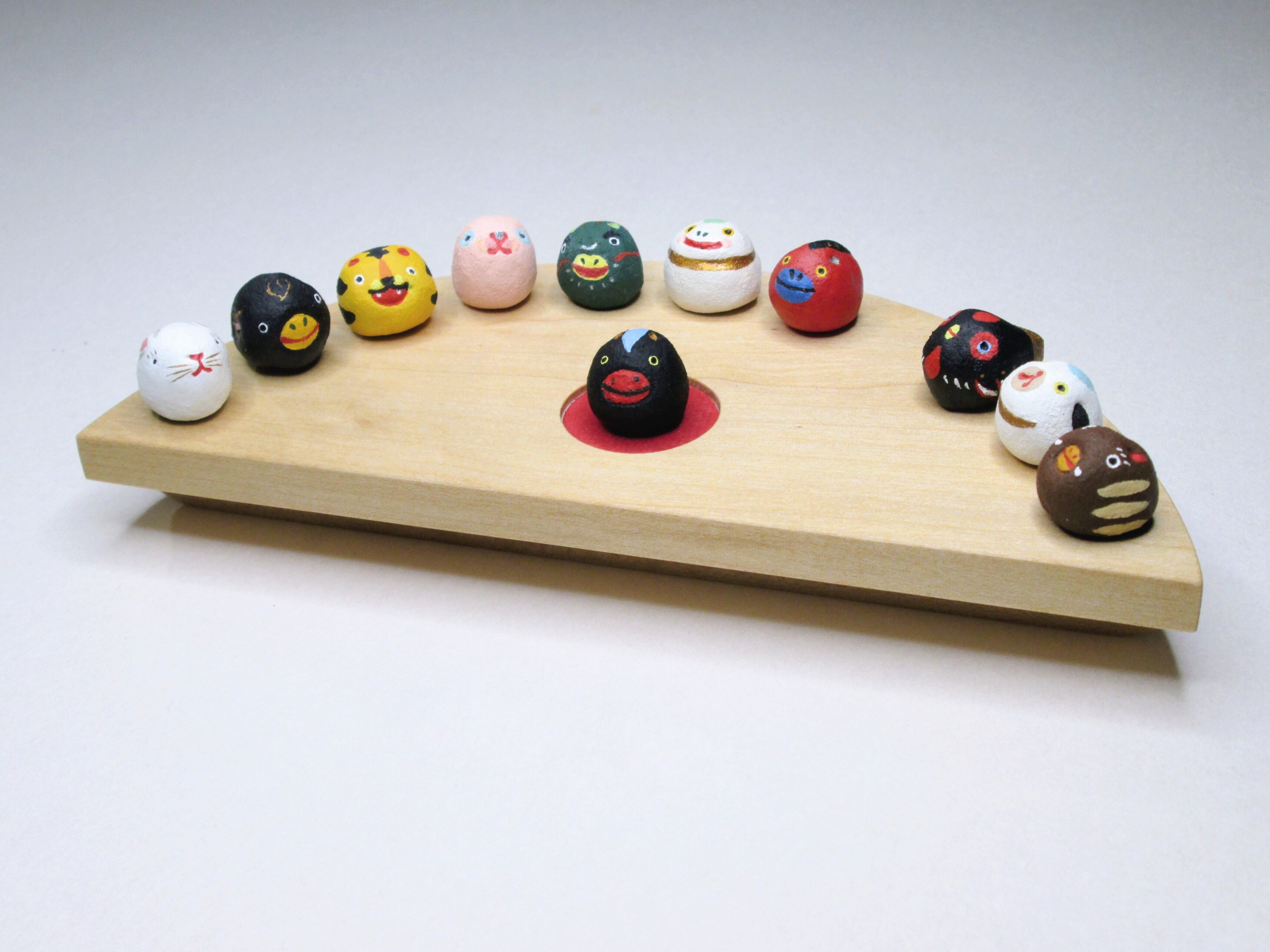 末広がりの扇型の中心に今年の豆干支を、その周りに他の十二支を並べて飾れる特別な台です。